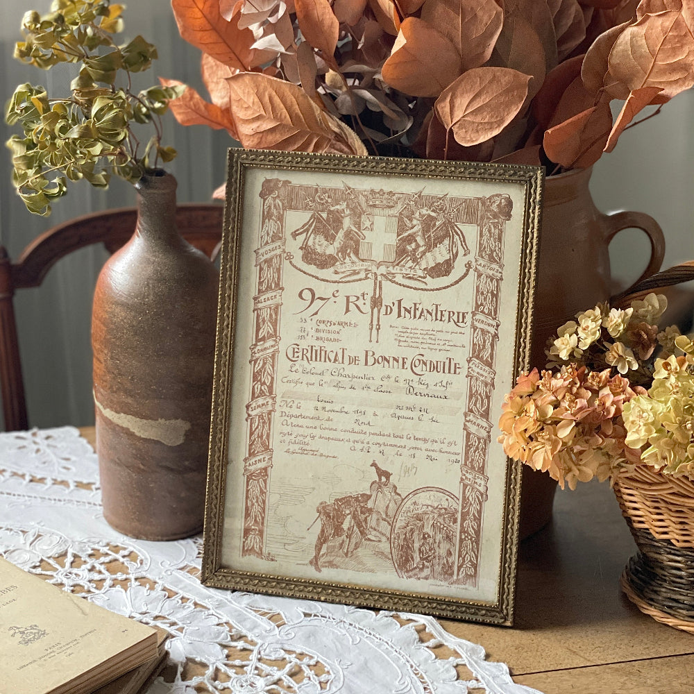 - 美術品・アンティーク・コレクション > コレクション > 古い手紙束 公証人 アンティーク フランス ヴィンテージ 一点物 no.182 フランス軍善行証書フレーム(24x34cm) フランスアンティーク